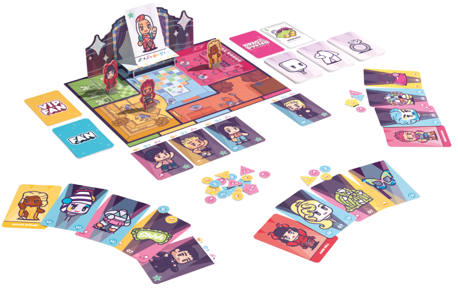 Drag & Dusted está diseñado para ser jugado de 2 a 6 personas. Es fácil, rápido y fomenta la interacción y la competencia entre los participantes. Utilizarás el tablero para situarte dentro del Glitterati Palace y mover a tus personajes drag. Crea tu atuendo para ganar talento y utiliza tus cartas para boicotear y robarle el protagonismo a tus rivales. Consigue tanta fama y fans para hacerte con la carta VIP y ganar el juego.
