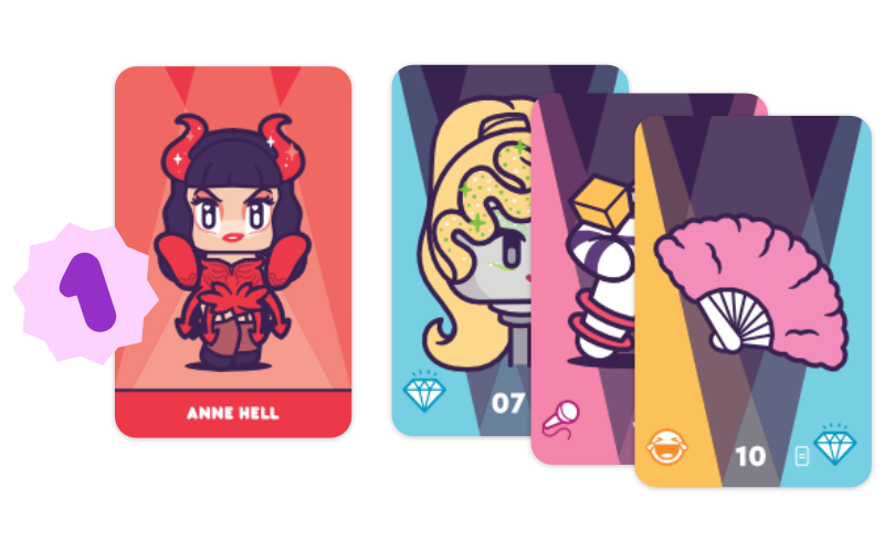 Escoge el personaje drag que más te guste y una carta de peluca, vestido y accesorio para tu outfit inicial.
