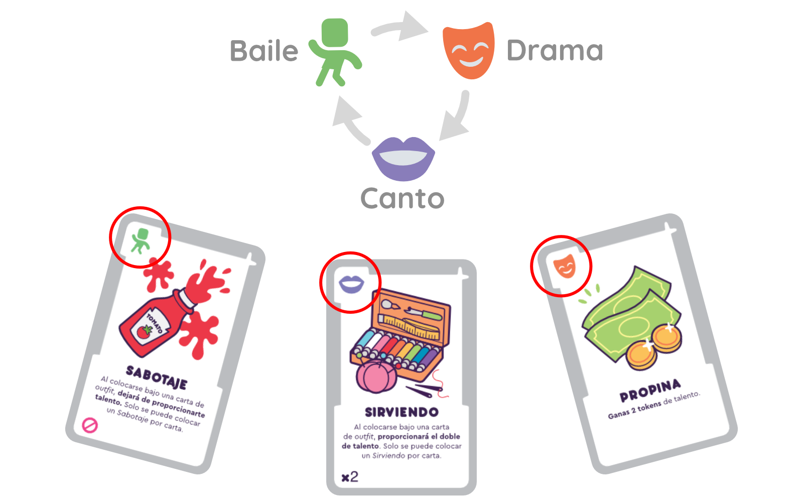 En algunos momentos la única solución será enfrentarse en un lipsync. Cada carta de acción tiene un ícono de drama, canto o baile, que funcionan como un clásico piedra, papel o tijera: Drama vence a canto, canto vence a baile, baile vence a drama.